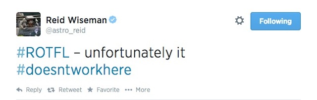 Still not following all of the astronauts—seriously, just every single one of them—on Twitter, despite how many times we suggest it? Here’s another great reason you should be: space jokes. This one comes from Astronaut Reid Wiseman, who is currently aboard the ISS. It’s so great that I’m only a little disappointed it didn’t come with a picture, because he’s been tweeting a lot of amazing ones.