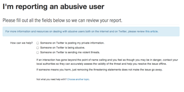 Each of the three options under “How can we help?” brings up slightly different fields allowing you to fill out a form that lets you identify the person, one or more specific tweets, the type of harassment, and fields to further specify any other harassment. It is a much more comprehensive way to report abuse than simply blocking someone and pretending that it means they can’t read your tweets anymore.