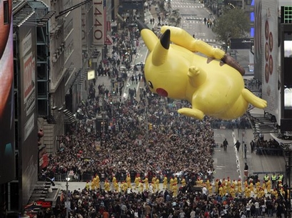 Well, in addition slow moving decorated vehicles covered in awkwardly lip syncing celebrities, the Macy’s Thanksgiving Day Parade also famously features balloons. A fifty foot tall Pikachu has been a member of the floating company since 2001, and this year he is reportedly going to be joined by a couple of new faces.
