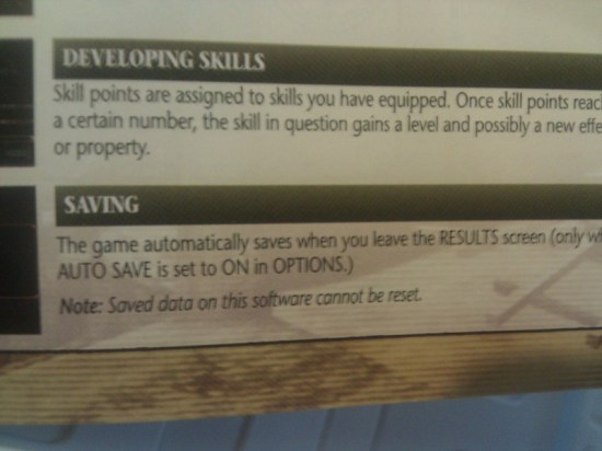 The above is a screenshot of the U.S. manual for Resident Evil: The Mercenaries 3D on the Nintendo 3DS. The bit at the bottom regarding save files means players cannot delete older save files, and considering the game only has one save slot, it means no one can ever create a completely fresh game, barring some kind of future update which frees up some slots, whether it be officially implemented by Capcom, or unofficially implemented by 3DS hackers. Why in the world would Capcom implement something like this in a game when one can only assume they want to reach the largest possible audience? To curb used game sales, of course!