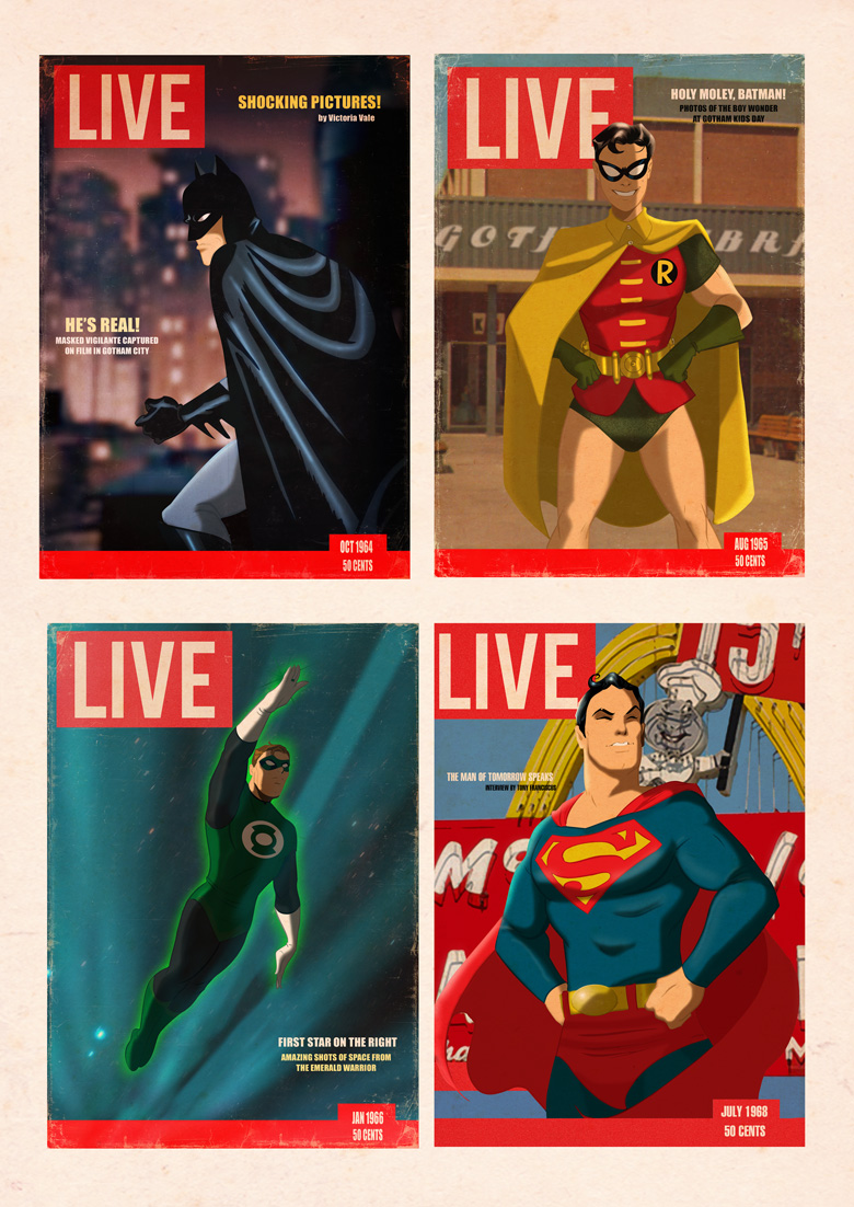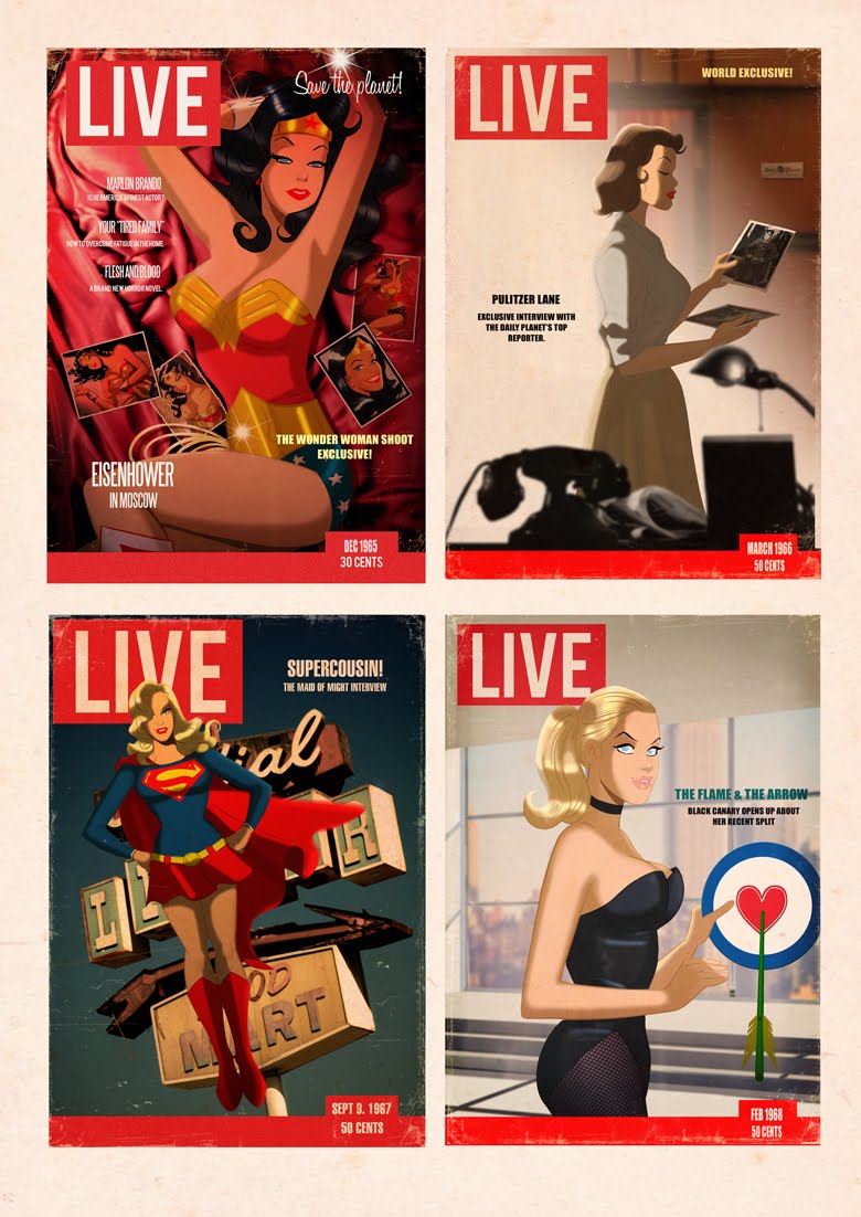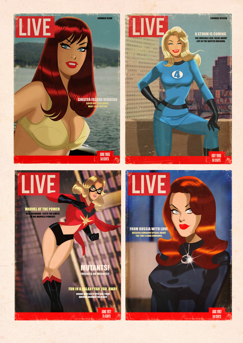 Pop artist Des Taylor has a collection of the bossest covers of Live Magazine, which doesn’t exist, but maybe it exists in Metropolis. Or at least a world in which all of comic book culture’s superheroes and superheroines are real. And in that world, their stories are the ones that make the covers of the most popular magazines, retro-style. After the jump, see Taylor’s pinup inspired covers, and then picture all the citizens of Spider-Man’s New York reading them on park benches.