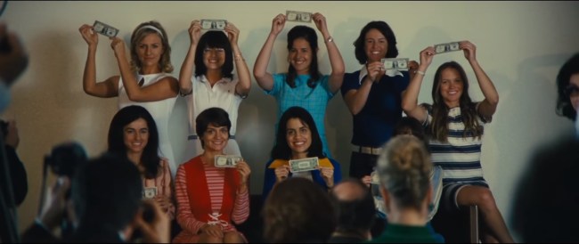 Billie Jean calls this into question, citing the fact that the women’s matches had equal ticket sales. Women bring in half the money, they should receive the same pay, no? Apparently, no. After trying to reason with Jack and not making a dent, Billie Jean threatens a boycott, saying that the female players will walk and start their own tour, taking their ticket sales with them. Kramer seems unperturbed, and so Billie Jean and Gladys walk out, determined to make good on Billie Jean’s threat, despite not being entirely sure what they’re doing.