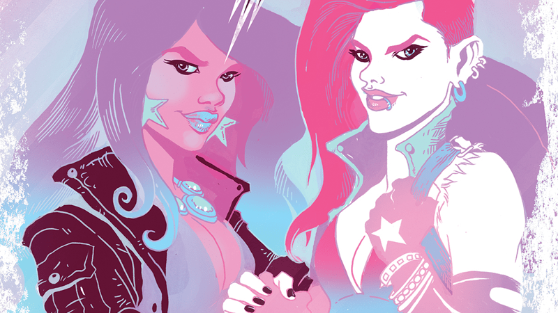 A cocktail made with two parts Tank Girl, one part Jem and the Holograms, and a splash of Lumberjanes-esque friendship, Kim & Kim from Black Mask Studios may be the funnest comic book of the summer. The story follows Kim D and Kim Q, a pair of planet hopping punk rock bounty hunters. Issue #1 introduces us to the Kims while they’re low on cash and decide to go after a huge payout. Their mission is complicated by the fact that they are trying to beat another team (Columbus and Saar) to the bounty. Saar and Kim Q have a complicated past, in part because they both worked with her estranged father.