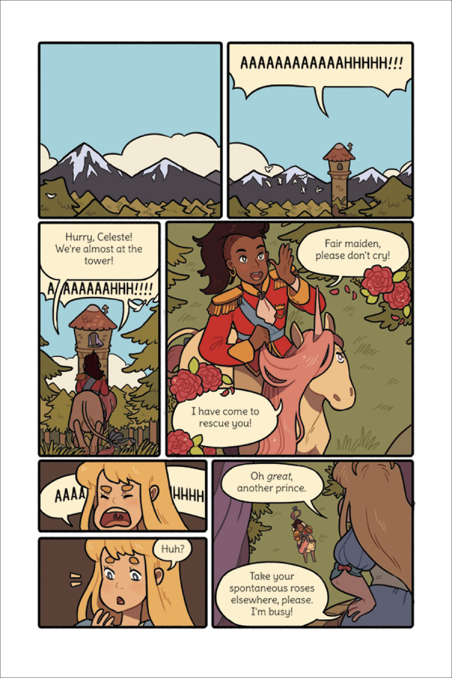 Princess Princess Ever After is a hardcover graphic novel collection of a web comic of the same name written and drawn by Katie O’Neill. It tells the story of two princess, both of whom would rather be anything else. Sadie is a blonde princess who at the top of the story is trapped in a tower with no one but a chubby dragon for a companion. Amira is a black princess who has run away from her princessy life to become a hero. She happens upon Sadie’s tower and decides to rescue her: