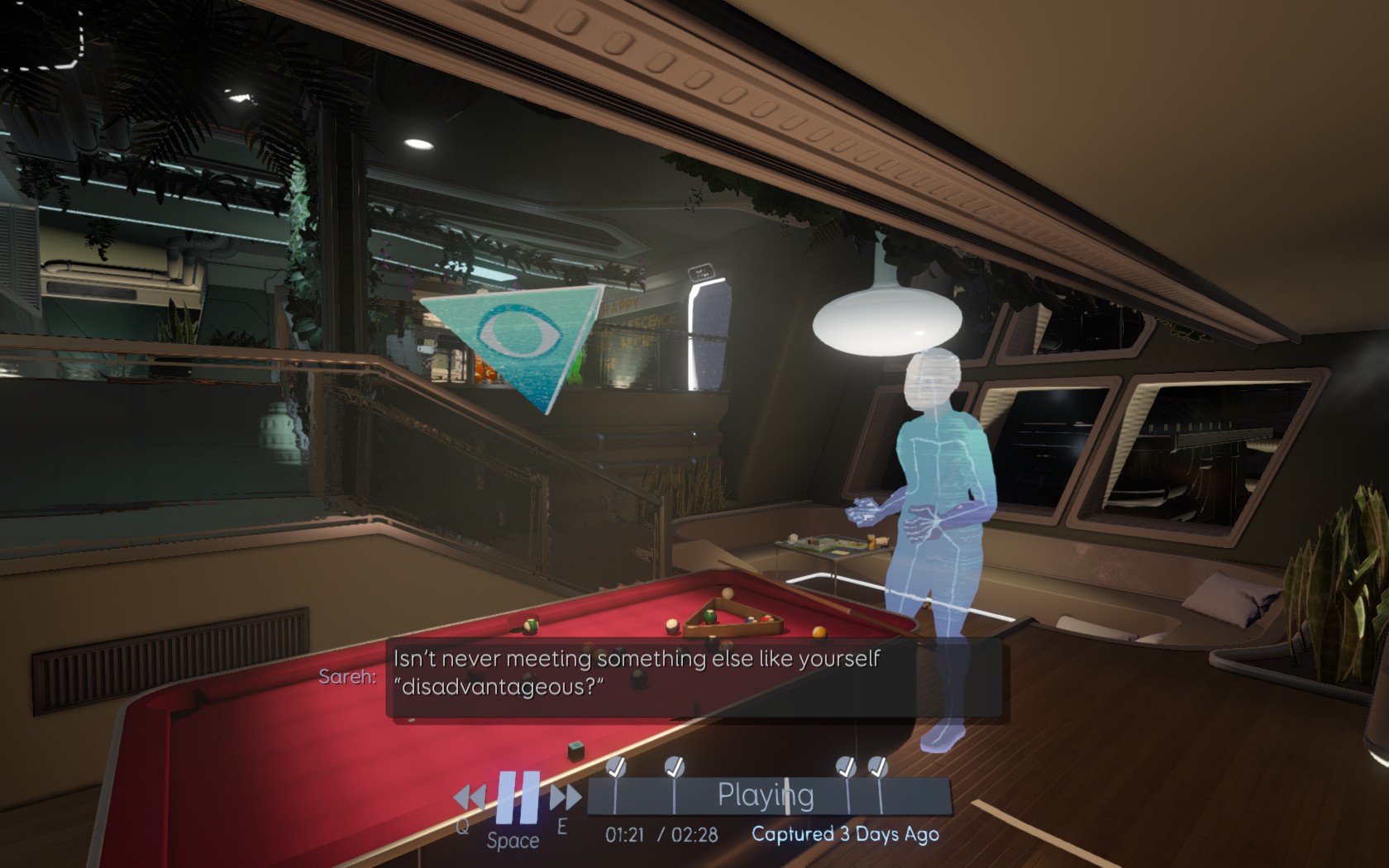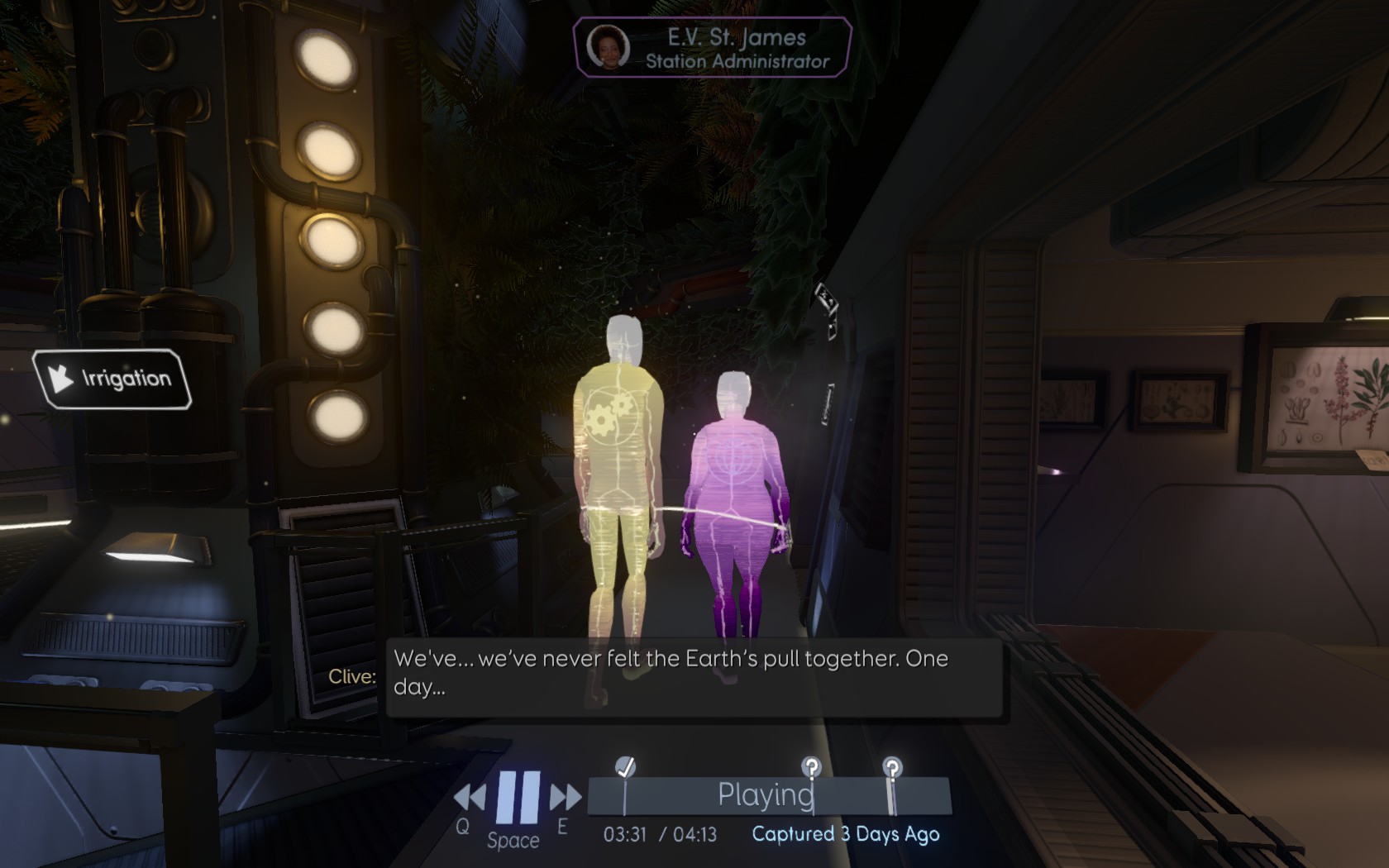 There was a certain kind of strangely cinematic quality to having this power where you can wander about and replay conversations and interactions at your own discretion. In the back of my mind, I knew that I was watching what amounted to a video recording, but it never once felt like that, even as I scrubbed back and forth listening to somebody, say, profess their love for another, or admit that they’re afraid for what might happen in the very near future. There was a poignancy to wandering around and experiencing this growing, unfolding story, knowing that I, as a character, was already wandering around a space station devoid of life.