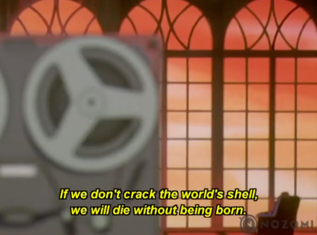 But first, a victory lap. Nanami catches Touga listening to a recording on loop. What is it? None other than his own voice insisting “If we don’t crack the world’s shell, we will die without being born” on tape, on loop. It’s a depressing look at the once only unflappable character in the series. I’m glad he’s suffering, but I doubt he’s totally out of the narrative, or that he won’t continue to push up against Utena.