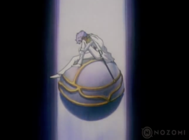 I initially thought this man was the purple-haired prince, and I hope we get some character names soon to make the distinction a little less flippant, because for now, I’m just going to use “Ponytail” and “Prince” to demarcate between the purple-haired men. Anyway, Ponytail arrives at the empty arena and zhooms up into the floating castle (really, the duel platform rises to the castle), where the actual Prince is resting on… A GIANT EGG. That’s right: we’ve reached the episode where Things Start Making Sense.
