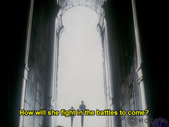 The implication by Ponytail is that she shouldn’t have made it through all seven trials as a duelist, and asks, Could she be the one they’ve (as in he and the Prince, but who knows who else) been waiting for? And finally: the final duel will be named “Revolution,” and then the Prince will be released and presumably the power of Dios with him. But the Prince doesn’t seem too happy about this, though Ponytail suggests that they’ll both “profit” at the end. What does that mean? We’ll soon find out, as Ponytail delivers this ominous degree through a dissonant twist on the show’s background music: “But, a new stage is about to begin. How will she fight in the battles to come?”