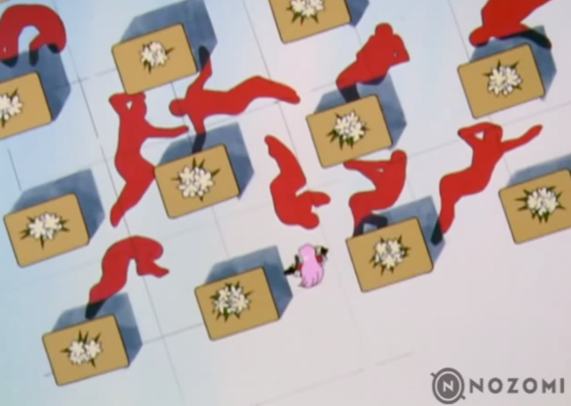 Then, the duel, but when Utena enters the dueling ground, she finds one hundred desks set out, each topped with a bouquet of white lilies. On the ground, these desks are surrounded by sudden red silhouettes… of bodies.