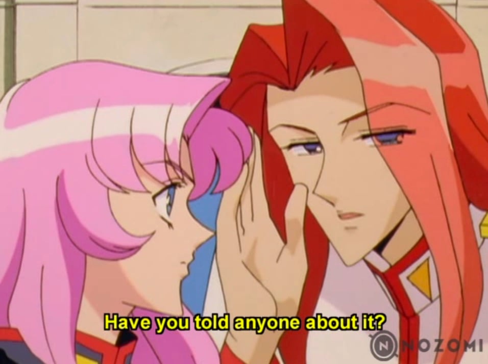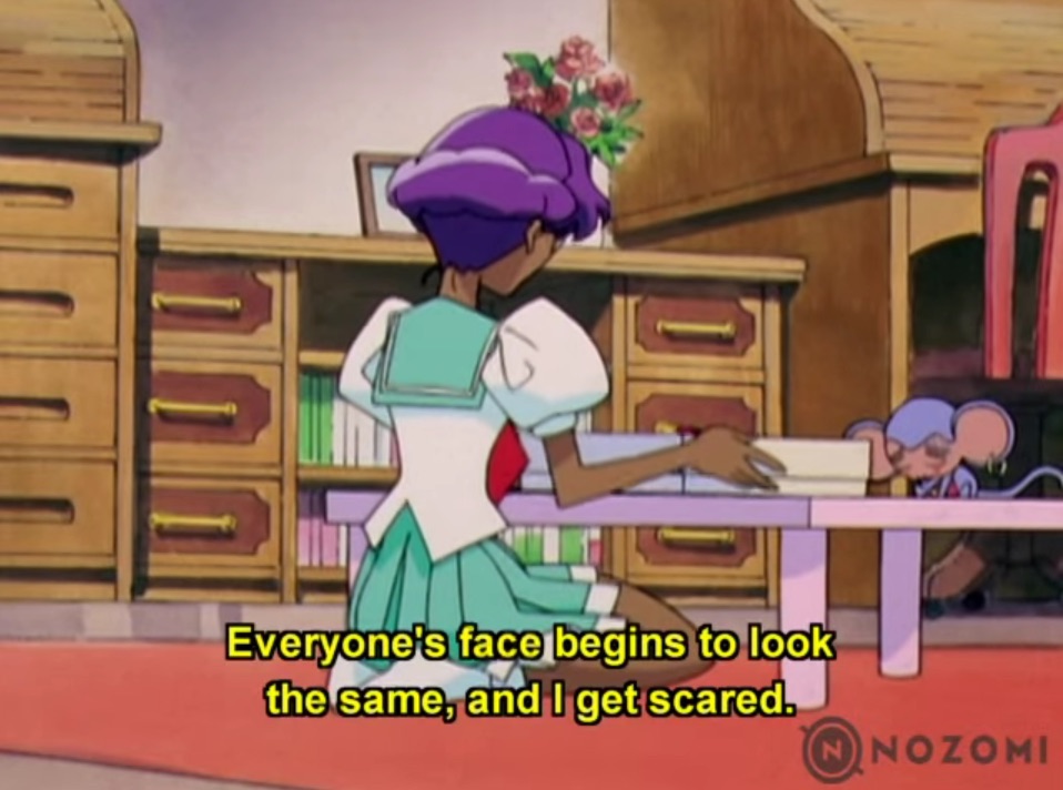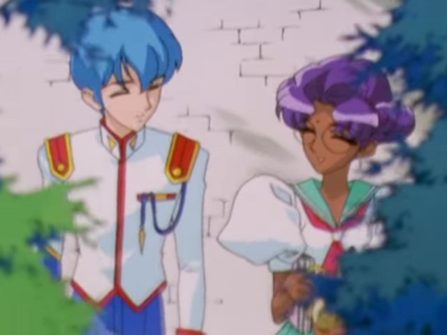 There, Utena teases him about his clear “admiration” of Anthy until she learns that he’s with the student council. (Was that not obvious by the uniform? Literally no one else has been shown wearing those white uniforms.) As people getting in Anthy’s shit generally leads to Utena having to put those people down, she accuses him of trying to make Machiavellian moves; he swears that’s not true, that Anthy just reminds him of someone from his past.