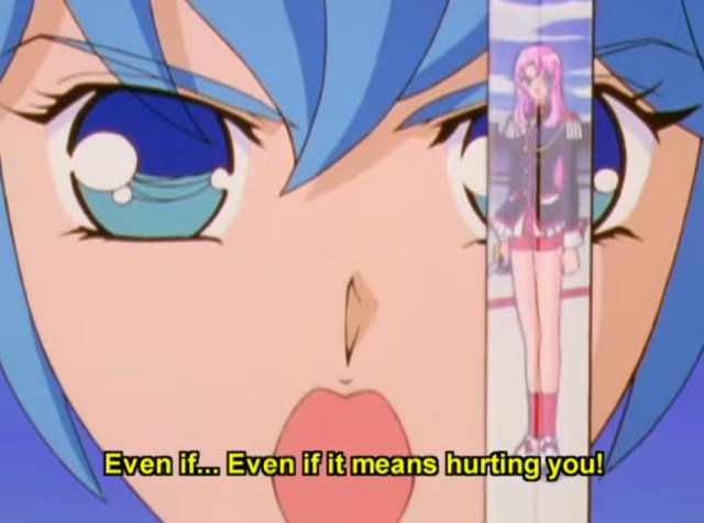 Miki blushes at the suggestion, but when Utena asks Anthy about it, the latter merely repeats her mantra: That she’s engaged to Utena and will only do whatever Utena wants/suggests her to do. Miki listens in as Utena rips that idea apart: “I can’t forgive a system that deprives someone of their personal freedom!” Word.