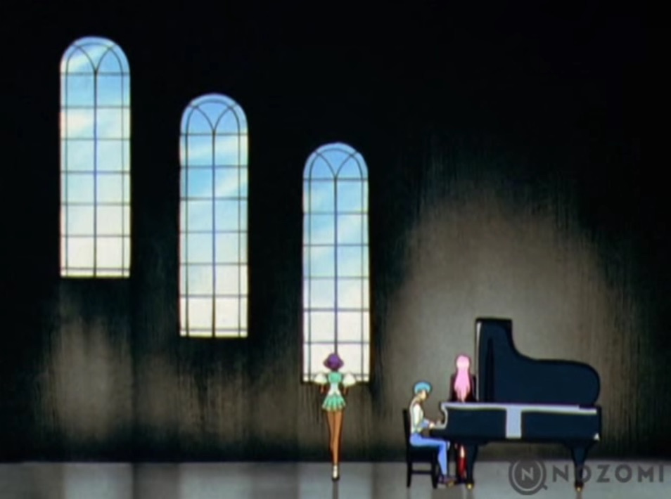 But then! A cut to Miki’s (nameless?) sister: She reveals that she’d only played piano because a cute boy next door told her he liked it. Though everyone assumed she was as good as her brother, including Miki, she was actually terrible; he was just good enough to follow her. Miki’s memory is a lie, or rather a very polished, one-sided version of reality; a good mirror, perhaps, of his “relationship” with Anthy.