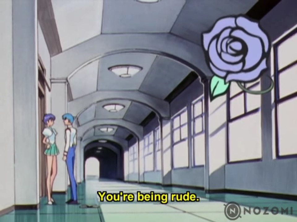 Touga wants to have taught Miki a lesson on “ownership,” or rather that if you don’t defend something/someone you like, someone else will take them away. Just then, Anthy walks in; Touga reminds Miki that if the student council’s dissolved, he’ll probably never have a shot at winning the hand and heart of the Rose Bride.