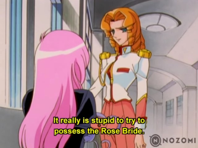 Utena then directly confronts the rumors about Jury: That she’s very, very powerful and gets stuff done, but in private, she’s ridiculously scary. Jury brushes the rumors aside, and probes Utena about dueling. Utena brushes the bait off, saying that she doesn’t really like sword-fighting, but then asks Jury about Anthy’s importance, to which Jury says: An engagement leads to getting “miraculous powers.” Jury dismisses this idea, calling it “stupid” to try to possess the Rose Bride.