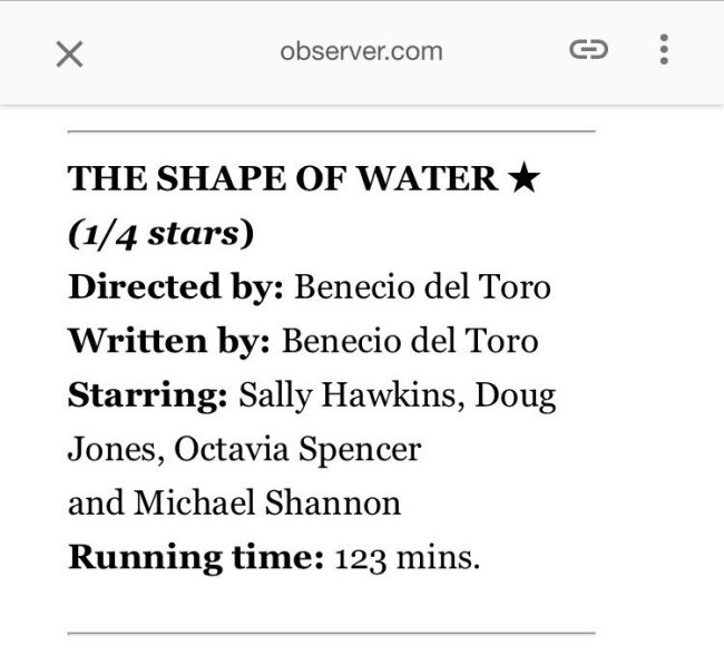 If you were already wondering how this 79-year-old sexist miscreant still has a job, just you wait. Because today, The Observer (where Reed presumably works without an editor or any sort of proofreader whatsoever) published his review of The Shape of Water. Or as he calls it, Benecio del Toro’s The Shape of Water.