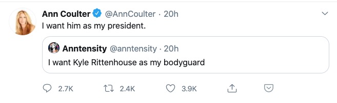 Ann Coulter retweeted someone saying they’d want Rittenhouse as their bodyguard, one-upping them by inexplicably wishing he were president. The tweet was deleted for violating Twitter rules.