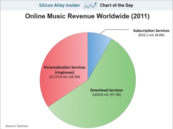 When Nokia introduced their new dubstep ringtone, I talked a lot of smack about the ringtone business and now it seems that I stand (moderately) corrected: The ringtone business is still worth a cool $2 billion. Somehow. Peter Kafka of AllThingsD seems to be one the one who dug up the interesting tidbit while looking over Gartner’s newest numbers. The ringtone industry, oddly listed as “Personalization Services,” actually makes up a pretty big part of online music revenue worldwide. They make roughly 4x more money than subscription services like Spotify and Rhapsody. How are those numbers going to change if streaming services really start gaining traction? Well, hopefully in a way that involves less ringtones.