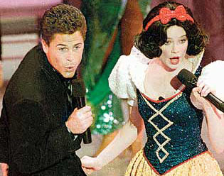 Even if Sacha Baron Cohen‘s blue-skinned love child takedown of James Cameron somehow gets reinstated for tonight’s Oscars, it’ll be hard to match the 61st Academy Awards in 1989. What has been called the worst Oscar ceremony ever opened up with sex scandal-ridden actor Rob Lowe teaming up with Snow White — yes, an actress dressed up as the Disney character — to perform an übercampy duet of Creedence Clearwater Revival’s “Proud Mary.”