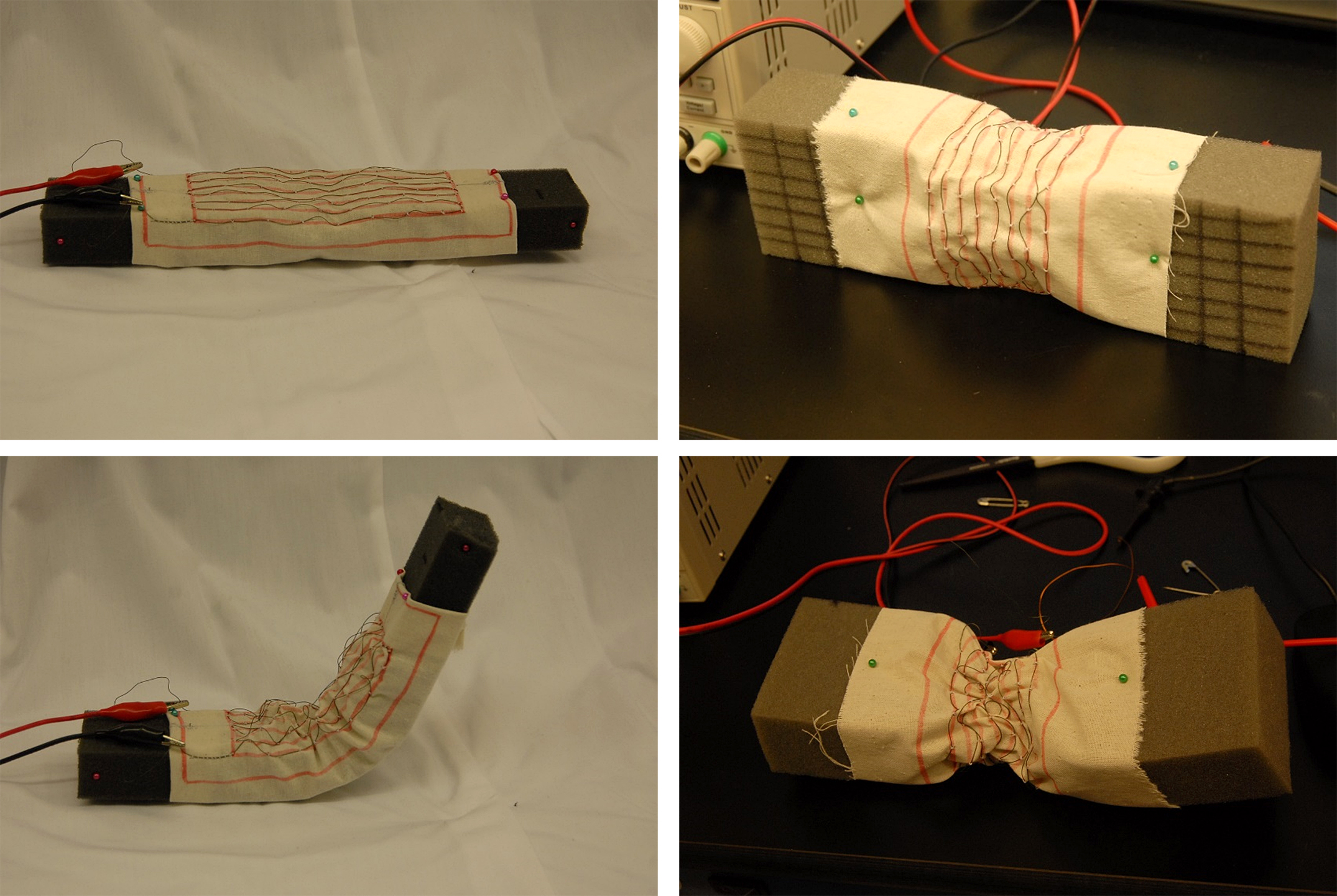 We have integrated both actuation and sensing, whereas most robotic fabrics currently in development feature only sensing or other electronic components that utilize conductive thread. We also use standard sewing techniques to introduce the thread-like actuators and sensors into the fabric, so they could conceivably be integrated into the existing textile manufacturing infrastructure.