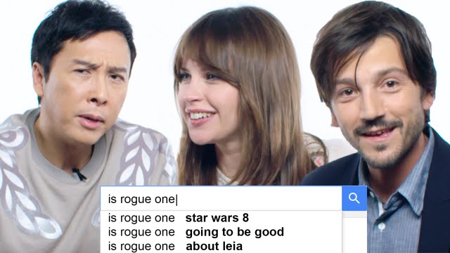 Actors generally get some pretty ridiculous questions from fans and interviewers alike while doing press for upcoming movies, but Google’s auto-complete crowdsources the absurdity to the entire Internet, and the results are … about what you’d expect. Here’s the Rogue One: A Star Wars Story cast (Felicity Jones, Donnie Yen, Diego Luna, Riz Ahmed, Ben Mendelsohn, and Alan Tudyk) fielding the burning questions their fans have been Googling.