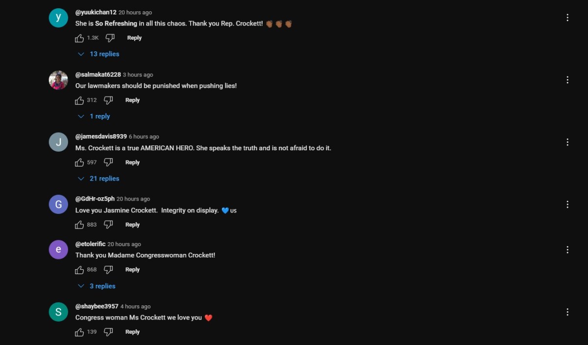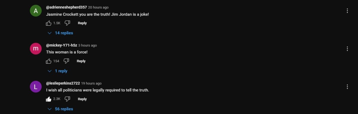 Social media users were disturbed by the exchange between Crockett and Jordan. One commenter on YouTube writes, “I wish all politicians were legally required to tell the truth.” Others were appalled at the suggestion that facts are debatable concepts.