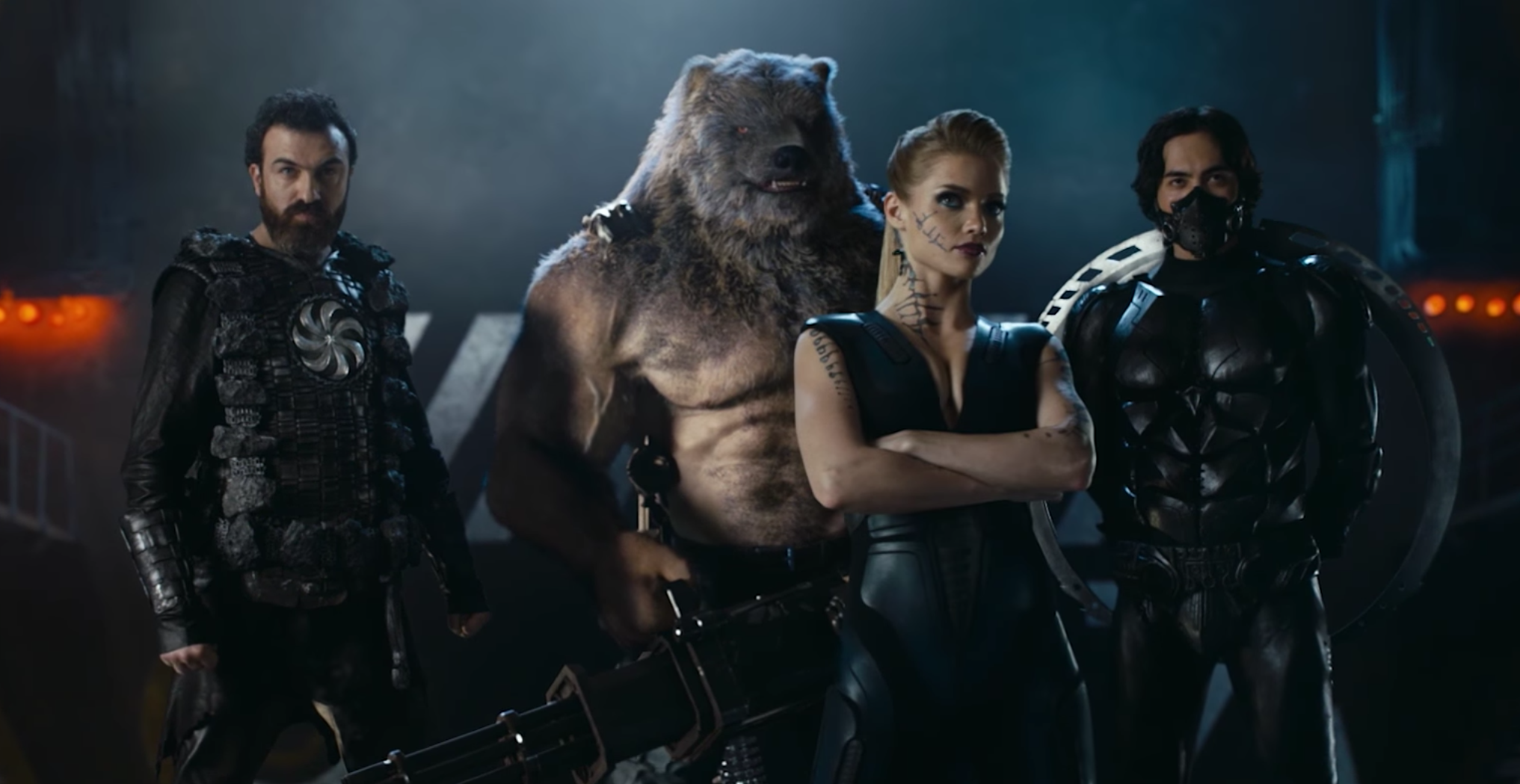- Finally, Ursus, or “Wildman,” played by Anton Pampushniy. Literally a man who can transform into a bear, he’s kind of a berserker or brawler-type. At the end of the trailer, when the heroes are given their supersuits, he’s presented with a gatling gun, the unveiling of which bears a similarity to when Rocket Raccoon and the Guardians of the Galaxy were first revealed in their initial trailer.