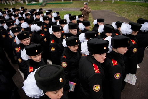 The Moscow Girls’ Cadet Boarding School is one of the new elite military academies in Russia. While most kids hate school for boring maths or history, the classes here include stripping down an AK-47 Kalashnikov rifle. And the girls can do it in the time it takes most kids to send an SMS. With a curriculum that includes drill, arms, first aid and federal law, one might expect it to turn into little Amazons. But femininity is also highly valued, so the evenings are reserved for such activities as sewing, ballet and compulsory choir practice. There are no mini-skirts and swear words, no smoking and drinking, and no hanging about unattended. Mobile phones are also banned except for a few minutes a day to talk with parents. A traditional Russian Winter Ball gives the girls a rare chance to meet the opposite sex, in this case from a nearby all-male boarding school boarding school called Moscow Cossacks Cadet Corps – another military-style academy founded during the Putin years.