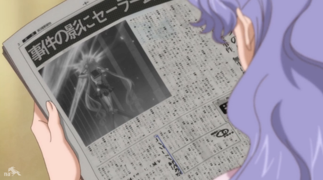 Luna wakes Usagi up the next morning to get her to school on time, and while Usagi’s multiple bedtime odango bows have never made sense to me (I wake up sometimes with my single hair scrunchie across the room, so how is her very complicated hairstyle so perfect upon waking up?) I appreciate that they’re still a thing. Downstairs, Ikuko is reading the paper and remarking about how cool Sailor Moon is and how Usagi should be more like her. Weirdly, the image in the paper shows her using an attack that she doesn’t actually begin to use until later in this exact episode. Ikuko, maybe stop worrying about your daughter and figure out why you appear to be in a reboot of Early Edition.