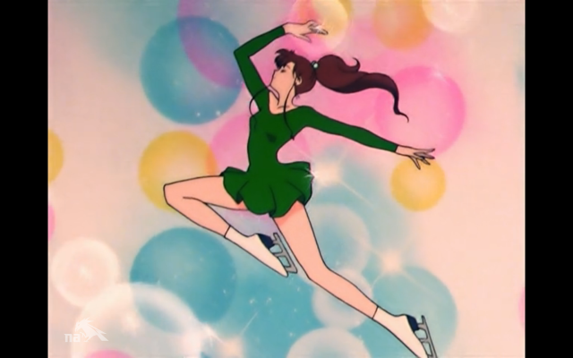 Inside, everybody puts on adorable skating costumes and, naturally, among a crowd of screaming girls, the Senshi are picked to go first. It’s no shock that Usagi is terrible at ice skating, reincarnated princess or no, because she’s literally never done it before, but the real surprise here (well, maybe not if you, you know, read the title of the episode) is that Makoto is really, really good at it.
