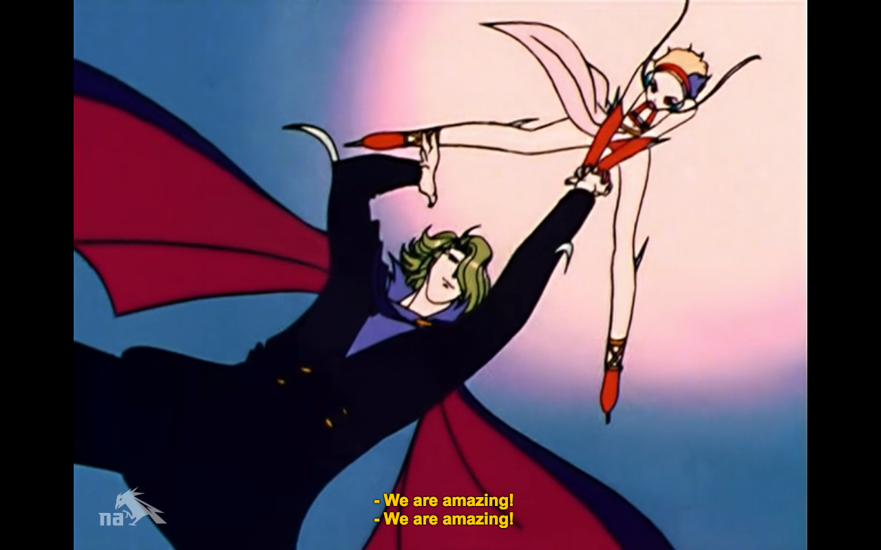 Yes, it turns out that the new bar for Usagi to clear in order to be considered to be taking her role as princess seriously is that she should be good at ice skating. This is revealed in a scene of Usagi and Minako watching the performance of Olympic medal winning (and presumably Russian) skating duo of Janelyn and Misha. “Oh yeah,” says Artemis, “ice skating was super popular in the Moon Kingdom, did we not mention that? At all? Ever in the whole series until right now? And the princess was, like, super good at it.” He did not, then, snicker behind his paws about how he’s getting all the Sailor Senshi to jump through hoops.