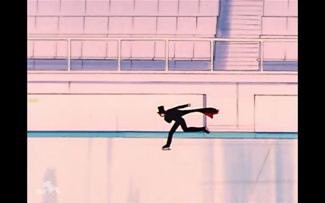 Unfortunately, even transformed, Usagi sucks at ice skating. But no fear! Speed-skating Tuxedo Mask is here!