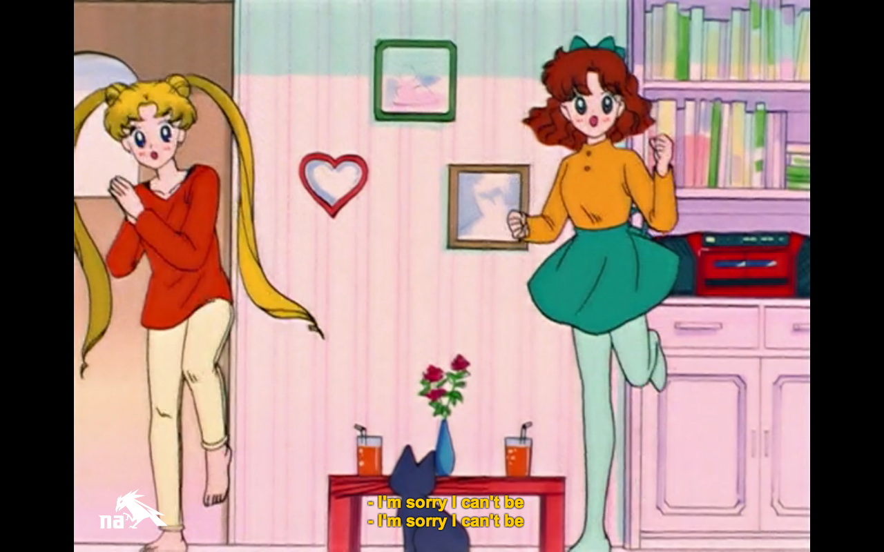 In this week, everybody is obsessed with teen idol Mikan Shiratori, including Jadite, who decides that preying on humanity’s desire to become famous is his latest scheme. He decides this while standing in plain sight, in a trenchcoat, hat, and glasses, watching Mikan sign autographs for a group of giggling girls, because he takes his life as a creepy villain very seriously. But it’s not just the bad guys: After a suggestion from Usagi’s-biggest-fan-Umino, she and Naru decide to try their own hands at becoming famous performers. Cue the most adorable thing ever: