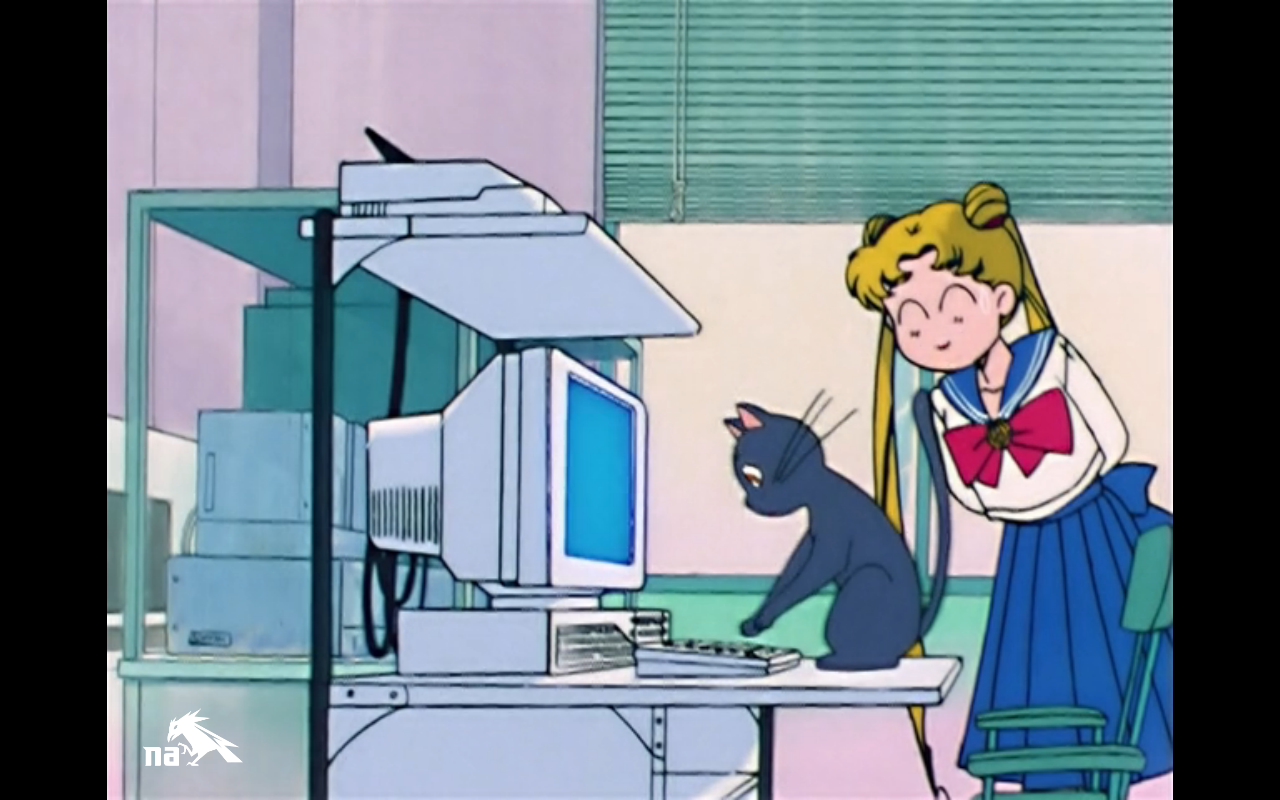 That’s not true, she also accidentally leaves Usagi with a floppy disk. Our heroine and Luna visit the cram school to try and return it, only to flee in terror before the appearance of Mamoru, who may or may not have heard Luna talking out loud. It’s too bad, because they totally miss disguised youma Garoben pressuring Ami into studying with her school-issued floppy disk like all the other students. Luna suggests that they go check out the contents of that disk before they just give it back to suspected-monster Ami and we get our first look at one of my favorite things in Sailor Moon.