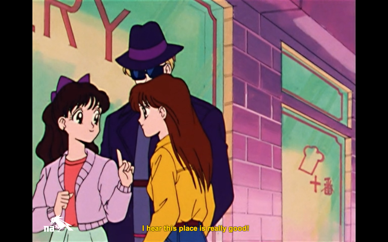 Sweetly, Usagi pointedly gets her fortune told by him and not that shiny place across the street, and he tells her that there’s a young man with a crush on her, one that she sees around a lot. This is the episode’s cue to remind us of all the men in Usagi’s life, including the first appearance of cute-guy-who-runs-the-arcade Motoki. The arcade has just received the new Sailor V game, which Usagi is terrible at. Nobody questions the plausibility or advisability of a video game based on a mysterious vigilante.