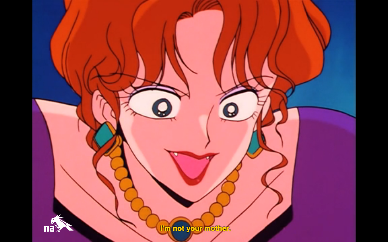 Usagi transforms and goes off to fight the evil fortune teller Baum (whose true form is totally like a futakuchi-onna, and I LOVE IT) and her gang of mind-controlled evil teenage boys. Baum is creepy but a significant let down from last episode’s mother-replacing, neck-twisting horror, frankly. Tuxedo Mask shows up to help, and by help I mean to lean casually against a door with his sparkly teeth and tell Sailor Moon not to give up. Taking heart, she destroys Baum with a tiara attack, and, his job finished, Tuxedo Mask immediately leaves.