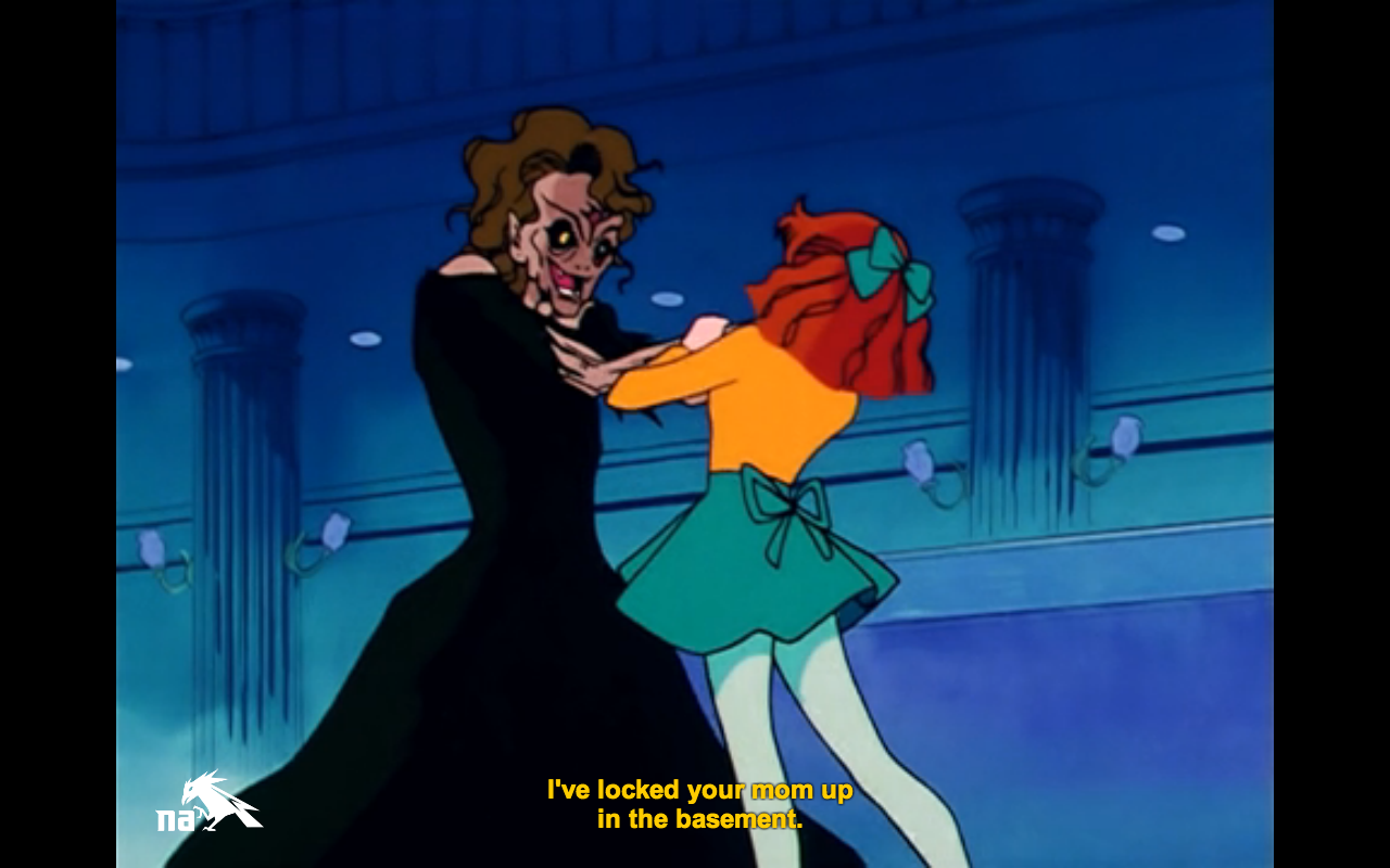 AAAAAAAAAAAAA. OKAY WHY DIDN’T ANYBODY TELL ME THAT SAILOR MOON VILLAINS WERE THIS CREEPY. Naru’s Other Mother turns all the women from the jewelry shop into a mind-controlled gang to attack Sailor Moon. And these women are hardcore: one of them just, like, has a broken bottle. Usagi, a fourteen year old with no idea how to fight, is rightly terrified, no matter what Luna tells her about her epic destiny. Fortunately, the intense frequency of her terrified wailing disrupts the mind control long enough that Tuxedo Mask has a chance to show up and provide moral support.