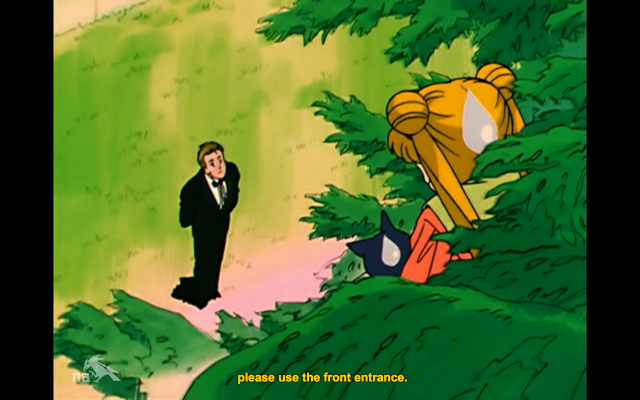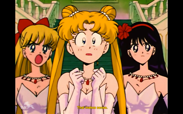 Between the reveal of Artemis being kind of an awkward secret keeper and his pretty consistent hardlining of Usagi’s development as a hero, I’m not sure whether the show is trying to make me dislike him, or if I’m predisposed to dislike him as the first male addition to an all female group. Maybe if the didn’t want me to see his presence as a the single naysaying one in a group of women, they should have had pretty much all the other Senshi on Usagi’s side for the past few episodes. It seems like Luna, Ami, Rei, Makoto, and Minako are all okay with the idea that a girl who found out that its her responsibility to save two worlds from destruction just as her true love was ripped from her and turned evil would need a bit of time to get used to the idea. CHILL OUT and be a better feminist ally, Artemis, is I guess what I’m saying.