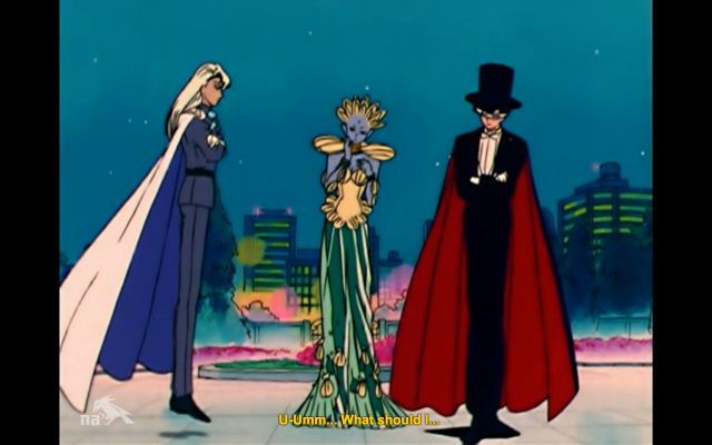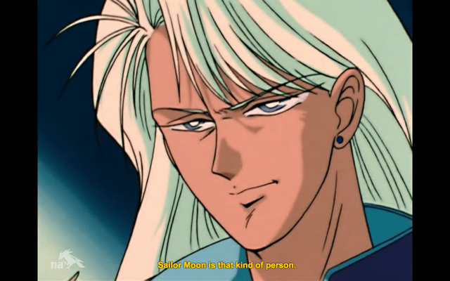 He tells Sailor Moon that if she gives him the Legendary Silver Crystal, he’ll let her live (against the orders of Queen Beryl, who wants the crystal AND Sailor Moon’s corpse). There’s a brief moment of indecision among the group until Kunzite shows up to countermand Endymion, and then all the confusion is on their poor youma helper as they shout conflicting orders at her.