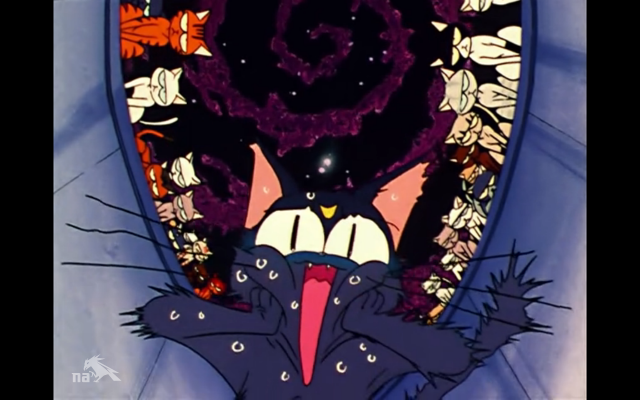 At the start of the episode, Luna is being chased through the streets by a literal hoard of stray cats. Apparently she got involved in some kind of stray cat turf war, but we are never given any details on it, so I’m just going to imagine that when she’s not guiding the Sailor Senshi, Luna is clawing (ha!) her way up the chain of command in some kind of feline mafia. Run by mafialines. We’ll call it the Catsa Nostra.