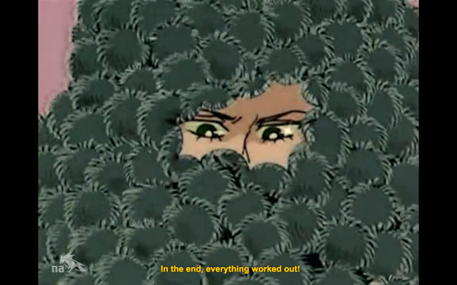Anyway, then there’s some kinda moment between Luna and Bakene, showing that they really do like each other, and then the rest of the Senshi show up (they bustled the little girl back into her house and have finally figured out that if the Moon Wand isn’t reacting to her while they’re in her bedroom, she probably doesn’t have the crystal) and Moon Healing Escalation him back to normal. Except where all the other youma yell “refresh” when they’re healed, Rhett Butler yells “meowfresh.”