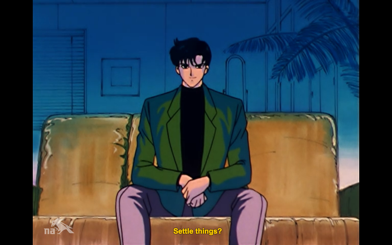 Zoisite challenges Mamoru to a final showdown, mano a mano [Editor’s note: excuse me Susana I think you mean mano a Mamo OHOHOHOkay I’ll leave now], at the “Starlight Tower” skyscraper that’s 100% coincidentally shaped like a giant crystal. Winner walks away with all seven Rainbow Crystals. Despite his injury, Mamoru accepts. I can feel the feels start to creep up on me. Stop it, Sailor Moon. It’s been weeks since Nephrite died. I put this behind me.