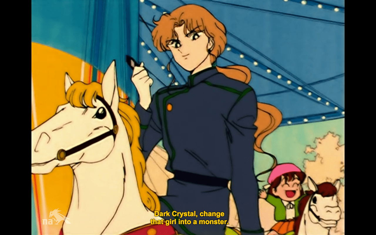 But it’s a good thing overall, because, in consistent behavior with the “Everyone in Sailor Moon is Faceblind” theory, Zoisite mistakes a dressed-up Umino for the actual Tuxedo Mask and retreats from Naru’s hallway. Why was he in Naru’s hallway? Well, because he’s enhanced the Dark Crystal to transform humans into youma, instead of turning humans with Great Youma inside them into youma, since all the Great Youma have now been banished.