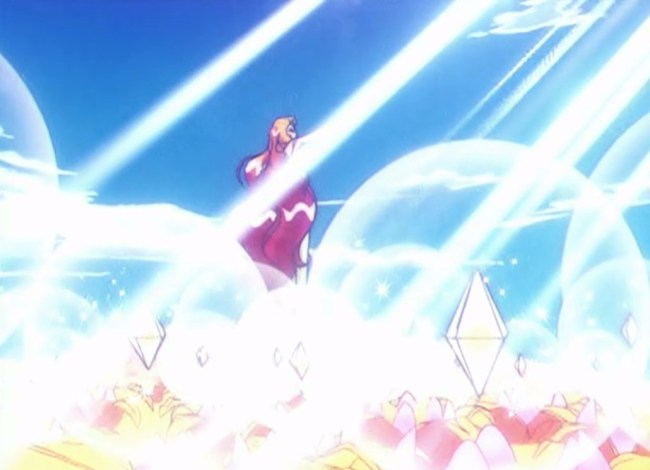 With the galaxy saved, C.C. disappears as arbitrarily as she arrived, Kakyu and the Lights return to their home planet, and Usagi and her friends go back to their dual lives as students and guardians. She and Mamoru make out beneath an alarmingly large moon as we bookend the series by having Usagi echo her early introductory monologue and the ORIGINAL OPENING THEME, YAAAAS, plays us through the end credits.