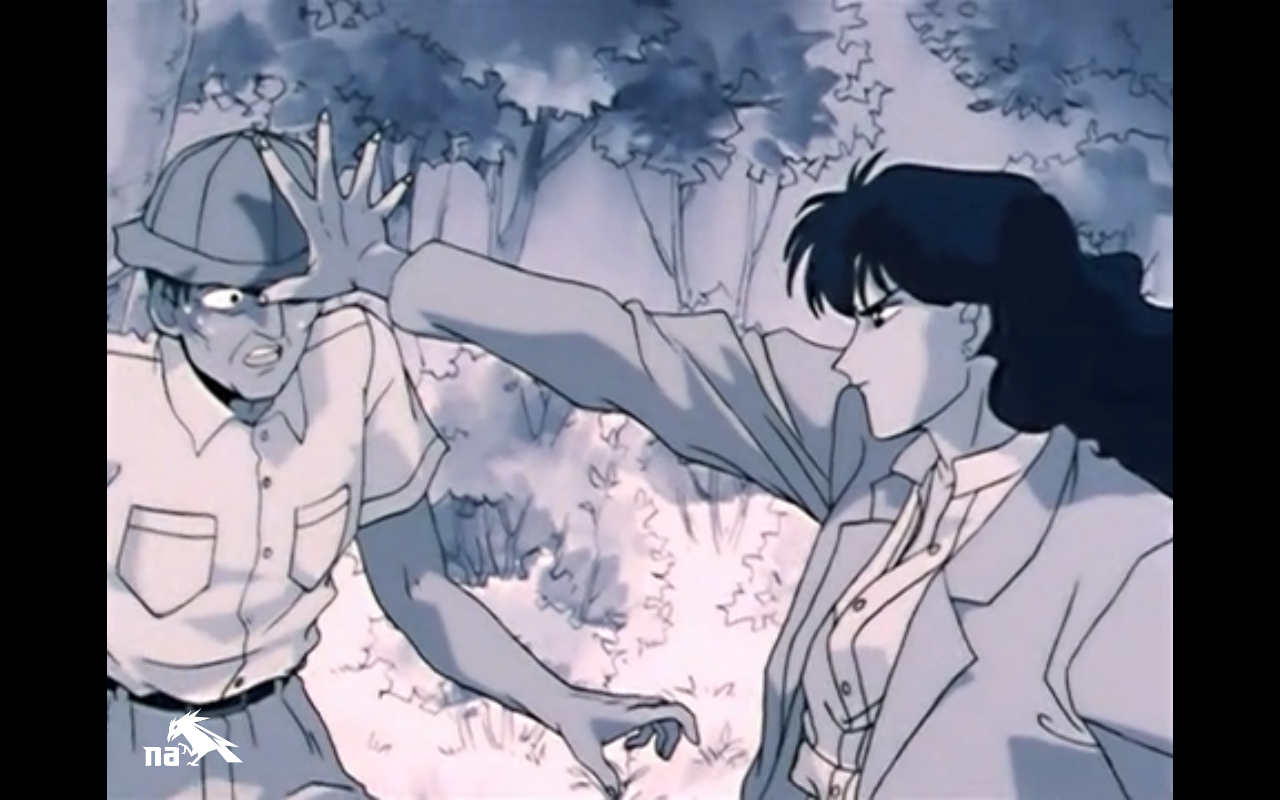 Well, we’ve been given an in to Mamoru’s personal life, and been introduced to a brand new character… what could be next… Oh yes! Nephrite picks Mr. Kokuritsu as this week’s lucky winner of the Getting All Your Energy Sucked Out sweepstakes, sponsored by the Cold Uncaring Movements of the Heavens. He shows up at the park just as Mr. Kokuritsu is moping over the sight of a night crew digging building foundations in his park, and tells the old man that it’s up to him to show humanity just what they’re doing to all those poor helpless animals, by making those animals into killing machines.