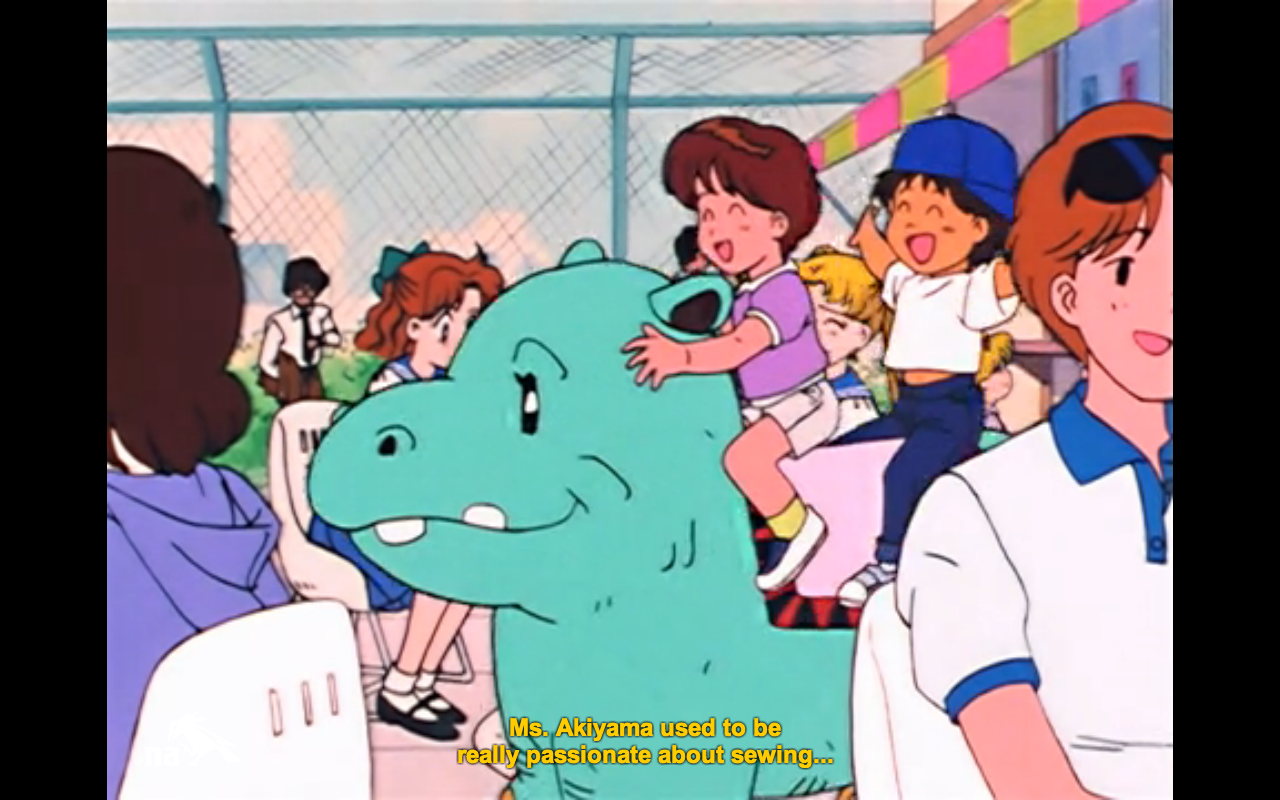 We bring you now to Usagi’s Home Economics class, where normally the details of seamstressing are riveting, but Home Ec teacher Ms. Akiyama is super distracted with happy thoughts of her upcoming nuptials to a short, dough-faced junior businessman, for which she’ll be hand-sewing her own beautiful wedding dress. Usagi pooh-poohs Ms. Akiyama’s choice of mate: she’ll never abandon her high standards for men. I.e., the college kid who works at the arcade and a formalwearing weirdo who won’t even tell her his name.