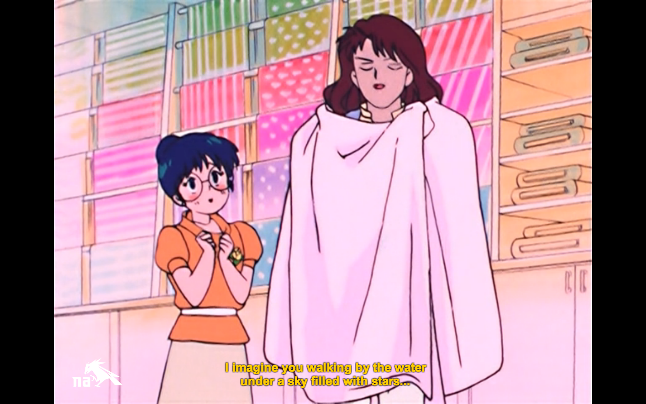 Ami tells Mr. Kokuritsu that it was all a bad dream, and a soaked Mamoru wanders up, not at all curious about how Rei (not to mention her acres of hair—I’m just saying, I have some personal experience) managed to get dry so fast. Rei still thinks he’s Tuxedo Mask, and Umino suggests that now that the panic is over, he and Usagi should continue their date. Usagi bluntly tells him to stop making things up, she never asked him on a date.