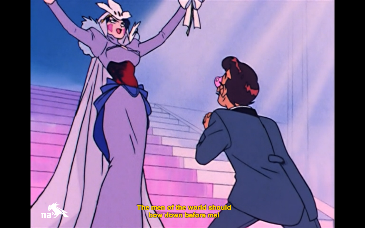 Oh, I forgot: Luna was there to point out that this looks like a Dark Kingdom scheme. And just like last episode, since Usagi is totally preoccupied with not-fighting-evil pursuits, Luna goes straight to Ami. They discover the other Sailor Senshi making more drastic efforts to throw together a wedding dress entry: Rei’s trying to steal the rental wedding dress of her grandfather’s shrine, and Usagi is sacrificing three months of allowance for permission to turn her mother’s favorite curtains into a gown. But eventually everybody gets gathered at the Juban Community Center, where the contest is kicking off. Luna orders Usagi to go in undercover as a contestant, but reminds her that she’s not allowed to win, since it’s cheating to use her disguise pen to make a wedding dress. The gang goes in to find Ms. Akiyama, but no luck. That is, until the contest begins, and she crashes it like Maleficent at a baby shower. The host tells her to cool it, and she just straight up mesmerizes everybody in the room. It’s a full on Galadriel moment.