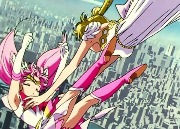 So Usagi does the only thing she can do: Uses those wicked sailor muscles to hitch a one-handed ride to the sky!