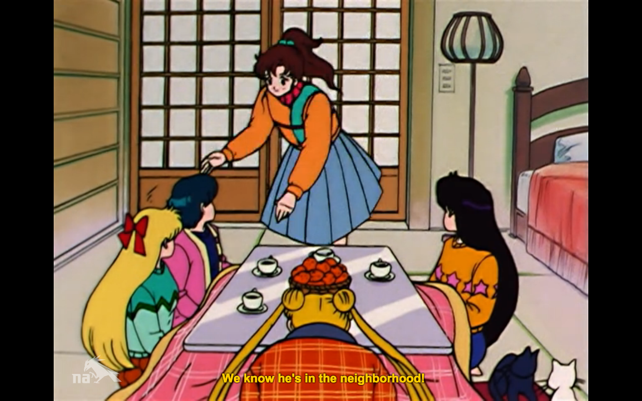 I don’t have much that’s profound to say about this episode other than the obvious: treading old ground. I’m not even really mad about that, just amused. Next week I get to find out about Minako’s apparently unforgettable ex-boyfriend, so I’m looking forward to see whether that can live up to the hype the series has created around that resolution. I think what this episode has brought to the fore is the show’s commitment to showing seasonal change. I know it’s probably just an excuse to depict the characters in several different outfits, possibly for merchandising reasons, but it’s dang cute seeing their personalities reflected in summer, fall, and winter outfits. Also until Sailor Moon I did not know that kotatsus were a thing, and now I super want one.