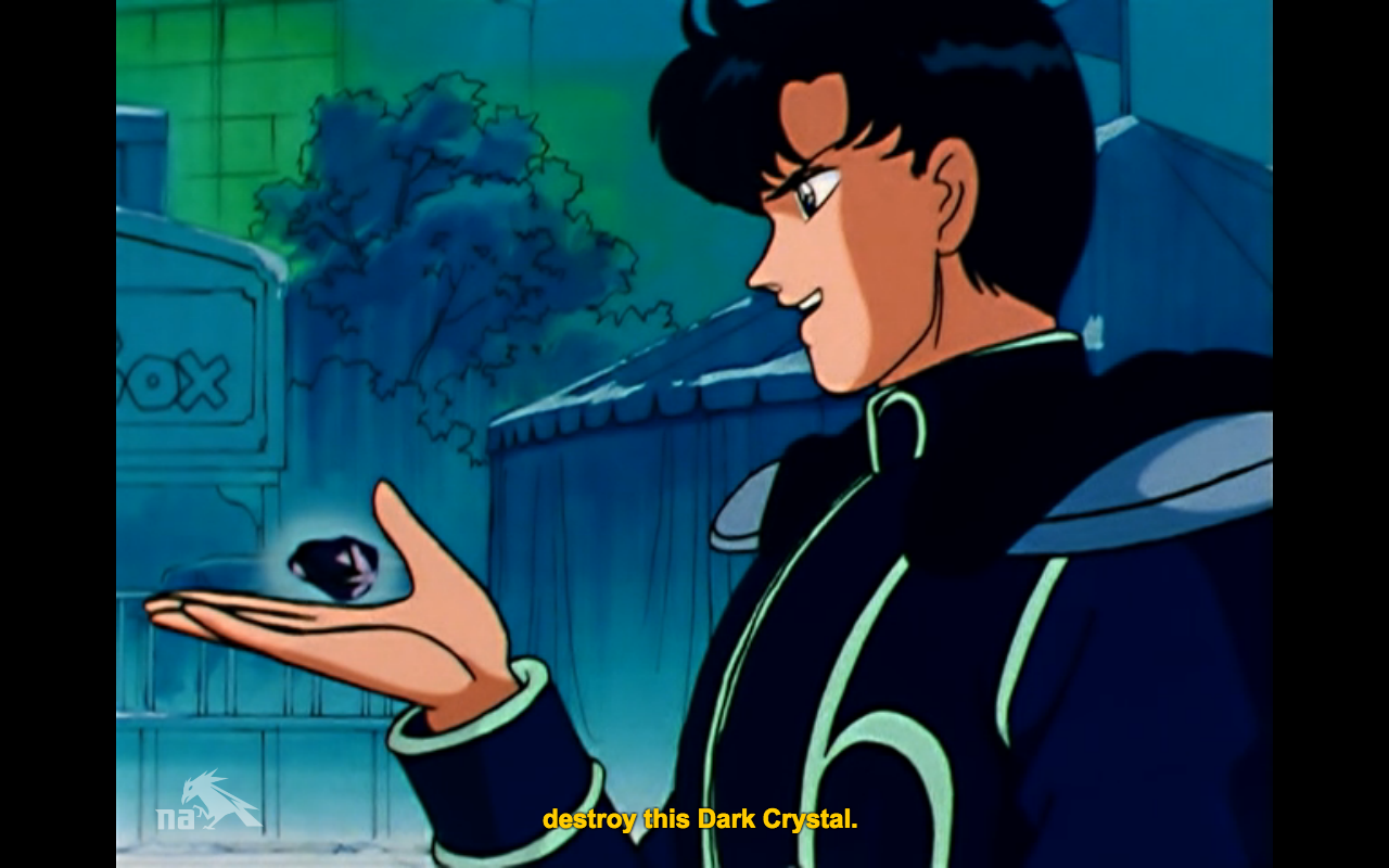 Ami attempts to take him out with Bubble Spray before he can do anything, but Endymion still gets Urawa into the Dark Crystal lickety split, because Bubble Spray is a purely defensive ability. Then he leaves immediately, travels to the Hikawa Shrine, and easily nabs Rei’s grandfather, as there are only two Senshi there to guard him. Then he summons the sevenfold youma and destroys the Sailor Senshi.